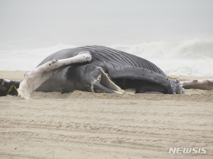 [워싱턴=AP/뉴시스] 미국 공화당 하원의원들은 지난해 12월 1일 이후 동부 해안에서 많은 고래 사체가 발견된 것은 해상풍력발전단지 때문이라며 16일(현지시간) 이의 가동 중단을 촉구하며 바이든 정부의 청정에너지 정책에 대한 대대적인 조사를 예고했다. 사진은 지난 2일 뉴저지주 해안에서 발견된 거대한 혹등고래 사체. 2023.03.17.