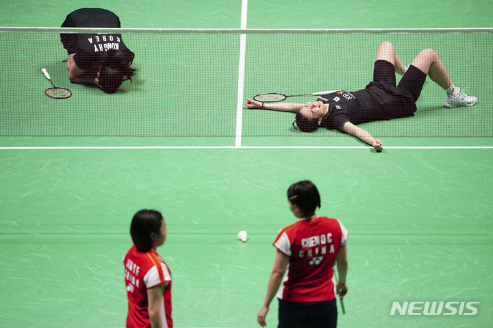 [버밍엄=AP/뉴시스] 김소영(위 오른쪽)-공희영이 17일(현지시간) 영국 버밍엄에서 열린 세계배드민턴연맹(BWF) 요넥스 전영오픈 여자복식 8강전에서 천칭천-자이판(중국)을 물리친 후 코트에 누워 기뻐하고 있다. 김소영-공희영(6위) 조는 세계 최강 천칭천-자이판(1위) 조에 2-1(19-21 22-20 24-22) 역전승을 거두고 준결승에 올랐다. 2023.03.18.