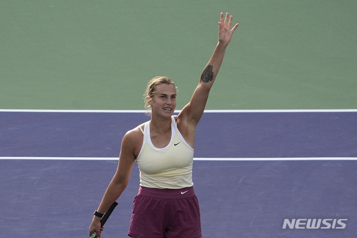 [인디언웰스=AP/뉴시스] 아리나 사발렌카(2위·벨라루스)가 17일(현지시간) 미 캘리포니아주 인디언웰스에서 열린 여자프로테니스(WTA) 투어 BNP 파리바 오픈 단식 준결승에서 마리아 사카리(7위·그리스)를 물리친 후 팬들에게 인사하고 있다. 올해 호주오픈 우승자인 사발렌카가 2-0(6-2 6-3)으로 승리하고 결승에 올라 호주오픈 결승에서 만났던 엘레나 리바키나(10위·카자흐스탄)와 다시 한번 우승을 다툰다. 2023.03.18.