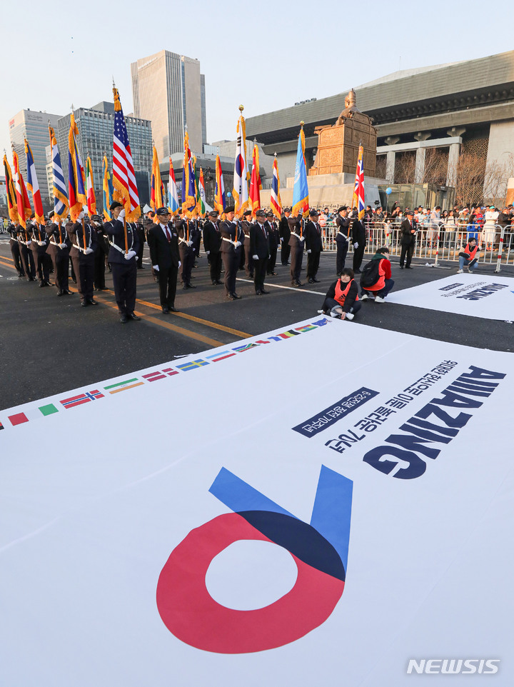 [서울=뉴시스] 권창회 기자 = 19일 오전 서울 종로구 광화문광장에서 열린 '2023 서울 마라톤 대회'에서 6·25전쟁 참전용사들과 학군사관 후보생들이 참전국들의 깃발을 들고 도열해 있다. 이날 마라톤 참가자들은 6·25전쟁 정전 70주년을 맞아 공식 브랜드가 새겨진 등번호를 달고 광화문광장에서 출발해 잠실종합운동장까지 달린다. 2023.03.19. [email protected]