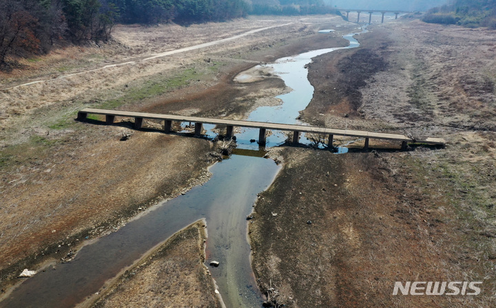 [화순=뉴시스] 이영주 기자 = 광주·전남에 가뭄이 이어지는 상황에 19일 오후 전남 화순군 사평면 주암호 상류에서 주암댐 건축 이후 수몰됐던 다리가 가뭄 여파로 모습을 드러냈다. 2023.03.19. [email protected]