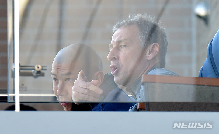 [대구=뉴시스] 이무열 기자 = 위르겐 클린스만 한국 축구대표팀 감독이 19일 오후 대구 북구 DGB대구은행파크에서 열린 2023 K리그1 4라운드 대구FC와 전북 현대의 경기를 차두리 어드바이저와 함께 지켜보고 있다. 2023.03.19. [email protected]