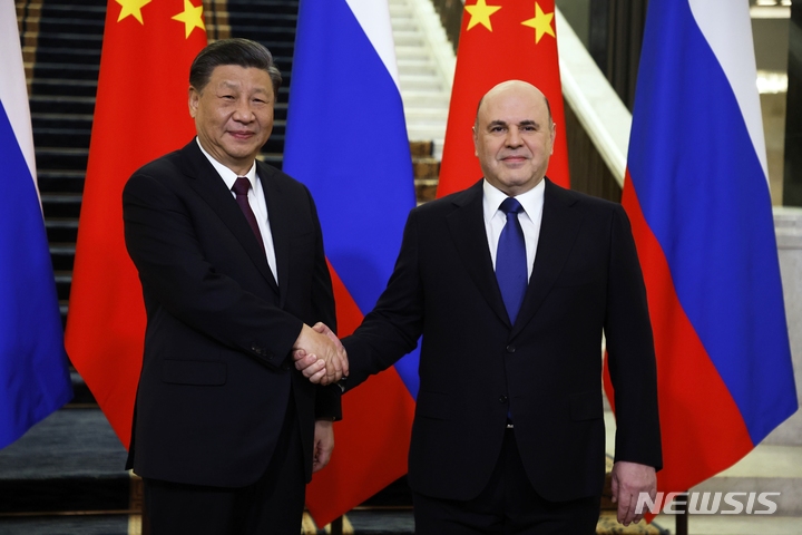 [모스크바=AP/뉴시스] 시진핑(왼쪽) 중국 국가주석이 21일(현지시간) 모스크바에서 미하일 미슈스틴 러시아 총리와 만나 악수하고 있다. 시 주석은 전날 블라디미르 푸틴 러시아 대통령과의 회담에서 푸틴 대통령을 중국에 초청했다고 밝혔다. 2023.03.21.