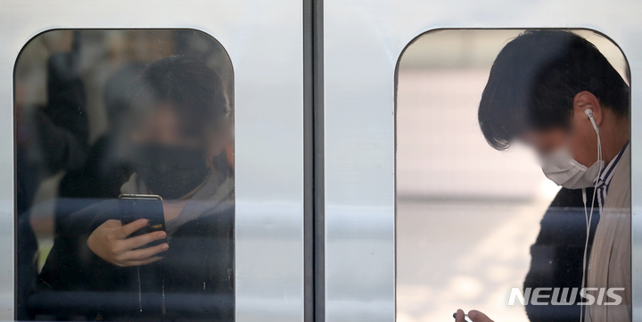 [서울=뉴시스] 조성우 기자 = 대중교통수단 내 마스크 착용 의무 해제 이틀째인 21일 오전 서울 지하철 2호선 열차 내에서 승객들이 마스크를 쓰고 있다. 2023.03.21. [email protected]