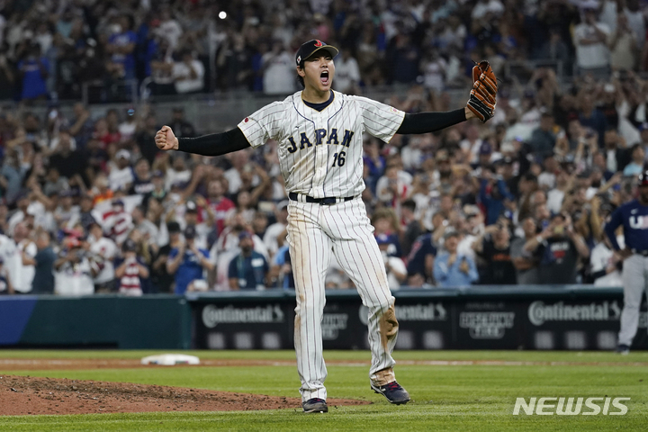 [마이애미=AP/뉴시스] 일본의 마무리 투수 오타니 쇼헤이가 21일(현지시간) 미 플로리다주 마이애미의 론디포 파크에서 열린 2023 월드베이스볼클래식(WBC) 결승 미국과의 경기 9회 초 투아웃 상황에서 마이크 트라웃을 삼진으로 잡고 환호하고 있다. 일본이 미국을 3-2로 꺾고 이 대회 통산 세 번째 정상에 올랐다. 2023.03.22.