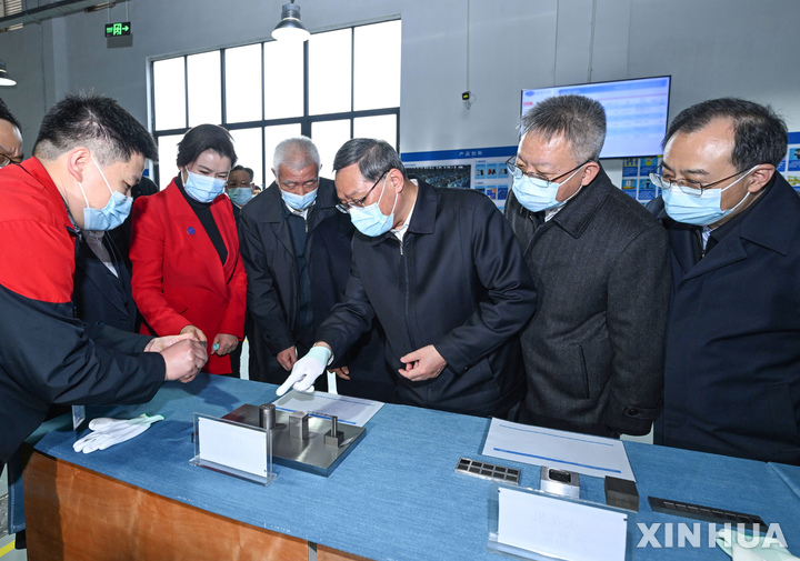 [창사=신화/뉴시스] 리창(가운데) 중국 총리가 22일(현지시간) 후난성 창사에 있는 렌즈기술유한공사를 방문해 둘러보고 있다. 리 총리는 21~22일 양일간 후난성의 제조 공장들을 시찰하고 선진제조업 발전 좌담회를 주재했다. 2023.03.23.