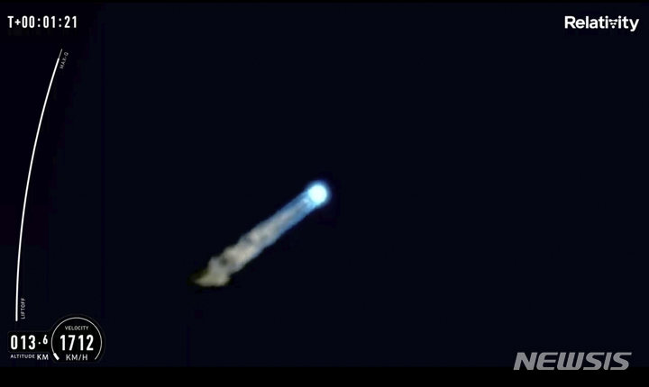 [케이프커내버럴=AP/뉴시스] 22일(현지시간) 미 플로리다주 케이프 커내버럴 우주군 기지에서 3D 프린팅 로켓 '테란1'이 발사되고 있다. 미국 우주 스타트업 '랠러티비티 스페이스'가 만든 3D 프린팅 로켓이 발사됐으나 궤도 진입에는 실패한 것으로 보인다고 현지 언론이 보도했다. 높이 33.5m, 지름 2.2m 크기의 ‘테란1’은 엔진 포함 질량의 85%가 금속 합금으로, 세계 최초의 3D 프린팅 로켓이다. 2023.03.23.