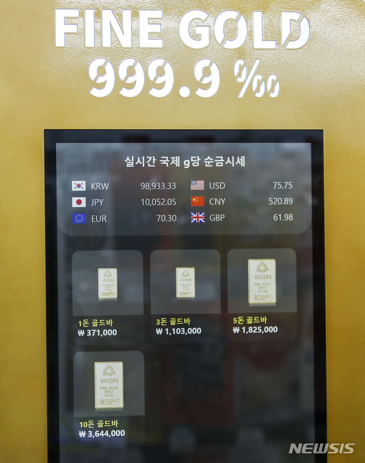 [서울=뉴시스] 정병혁 기자 = 23일 서울 강남구 GS25 역삼홍인점에 설치된 골드바 자판기에 금 시세가 나타나 있다. 미국 실리콘밸리은행(SVB) 파산 여파로 글로벌 금융 시장이 흔들리면서 안전 자산 선호 현상에 국제 금값이 급등하고 있다. 국제 금 선물 가격은 지난 20일 온스당 2000달러(약 260만원)를 돌파했다. 금값은 지난해 3월 러시아의 우크라이나 침공 이후 처음으로 2000달러를 넘어섰다. 2023.03.23. [email protected]