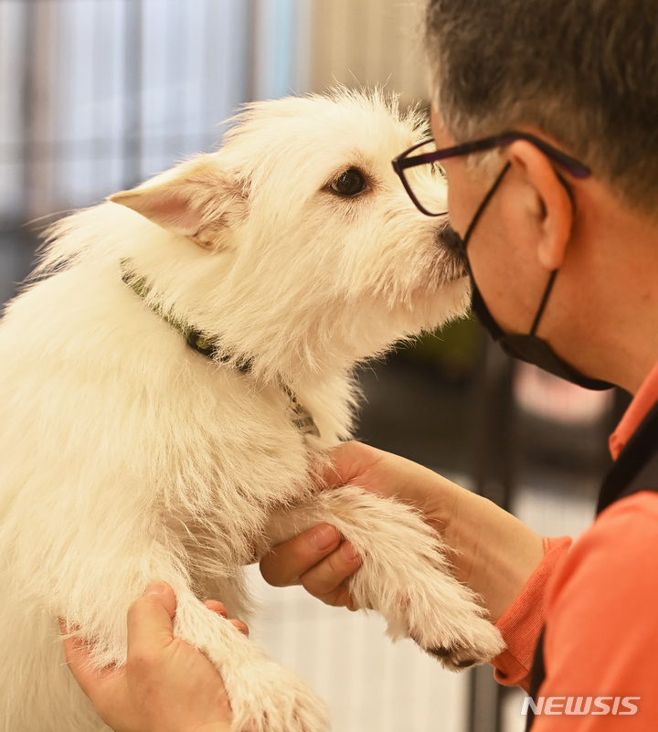 [수원=뉴시스] 김종택 기자 = 국제 강아지의 날인 23일 오후 경기도 수원시 팔달구 경기도 반려동물 입양센터에서 관계자들이 새 주인을 기다리고 있는 강아지를 돌보고 있다. 국제 강아지의 날은 모든 강아지를 사랑하고 유기견 입양문화를 정착하자는 취지로 제정됐다. 2023.03.23. [email protected]