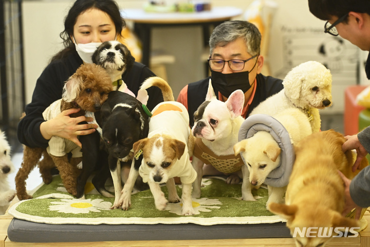 [수원=뉴시스] 김종택 기자 = 국제 강아지의 날인 23일 오후 경기도 수원시 팔달구 경기도 반려동물 입양센터에서 관계자들이 새 주인을 기다리고 있는 강아지를 돌보고 있다. 국제 강아지의 날은 모든 강아지를 사랑하고 유기견 입양문화를 정착하자는 취지로 제정됐다. 2023.03.23. [email protected]