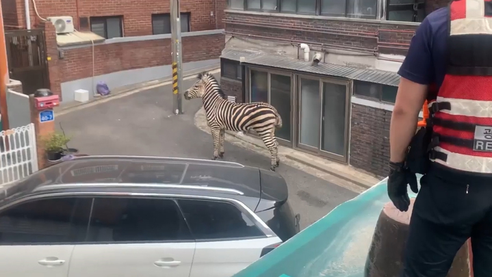 [서울=뉴시스] 23일 오후 서울 광진구 주택가에 얼룩말이 나타났다. 광진소방서는 이날 오후 2시 43분께 얼룩말 한 마리가 주택가를 활보하고 있다는 신고가 접수됐다고 전했다. 얼룩말은 인근 어린이대공원에서 탈출한 것으로 밝혀졌다. (사진=광진소방서 제공) 2023.03.23. [email protected] *재판매 및 DB 금지