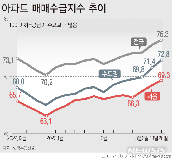 [서울=뉴시스] 24일 한국부동산원에 따르면 3월 셋째 주 수도권 아파트 매매수급지수는 72.8로 지난해 11월 첫째 주(73.0) 이후 약 4개월 만에 가장 높은 수치를 기록했다. 다만 매매수급지수는 기준선 100에 한참 못 미치는 수준으로 여전히 매수세가 약한 모습이다. (그래픽=안지혜 기자)