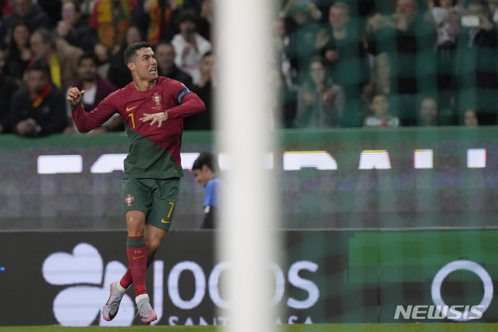[리스본=AP/뉴시스] 포르투갈의 크리스티아누 호날두가 23일(현지시간) 포르투갈 리스본의 이스타디우 조제 알발리드에서 열린 유럽축구연맹(UEFA) 유로2024 조별리그 J조 1차전 리히텐슈타인과의 경기 후반 18분 팀의 네 번째 골을 넣고 환호하고 있다. 호날두가 멀티 골을 기록한 포르투갈이 4-0 대승을 거뒀으며 호날두는 A매치 역대 최다 출전(197경기) 신기록을 썼다. 2023.03.24.