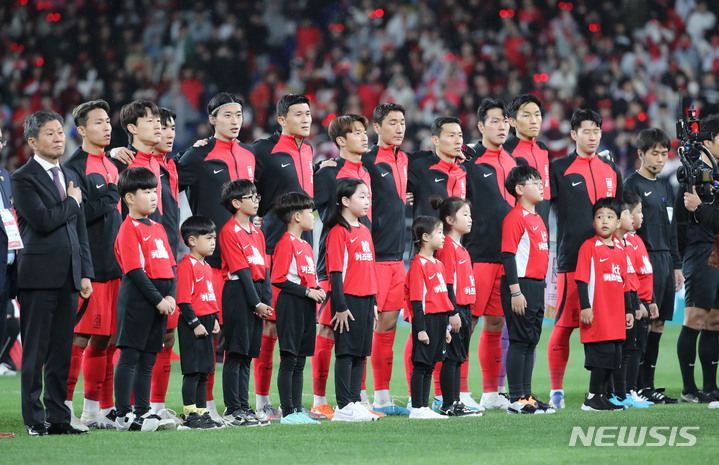 [울산=뉴시스] 권창회 기자 = 24일 오후 울산 남구 문수축구경기장에서 열린 하나은행 초청 축구 국가대표 평가전 대한민국과 콜롬비아의 경기, 한국 대표팀이 애국가를 부르고 있다. 2023.03.24. [email protected]