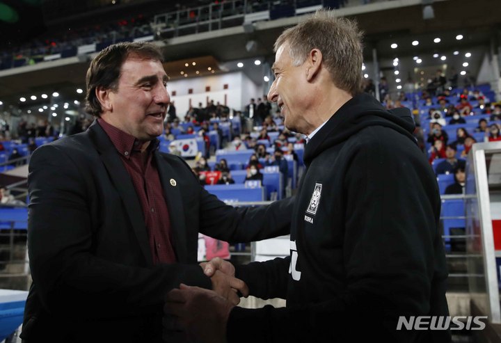 [울산=뉴시스] 정병혁 기자 = 24일 오후 울산 남구 문수축구경기장에서 열린 하나은행 초청 축구 국가대표 평가전 대한민국과 콜롬비아의 경기에 앞서 대한민국 위르겐 클린스만 감독과 콜롬비아 네스토르 로렌조 감독이 인사를 나누고 있다. 2023.03.24. [email protected]