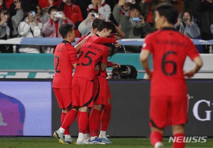 [울산=뉴시스] 정병혁 기자 = 24일 오후 울산 남구 문수축구경기장에서 열린 하나은행 초청 축구 국가대표 평가전 대한민국과 콜롬비아의 경기, 대한민국 손흥민과 선수들이 두번재 골에 성공한 뒤 기뻐하고 있다. 2023.03.24. [email protected]