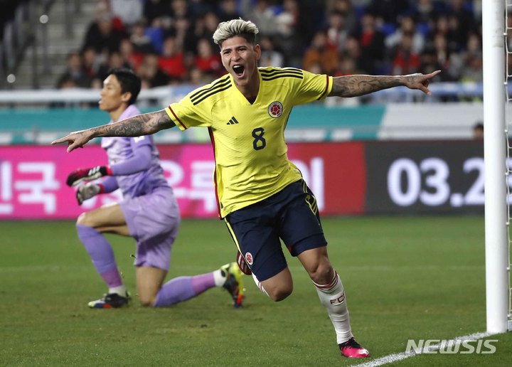 [울산=뉴시스] 정병혁 기자 = 24일 오후 울산 남구 문수축구경기장에서 열린 하나은행 초청 축구 국가대표 평가전 대한민국과 콜롬비아의 경기, 콜롬비아 호르헤 카라스칼이 동점골을 넣은 뒤 기뻐하고 있다. 2023.03.24. [email protected]