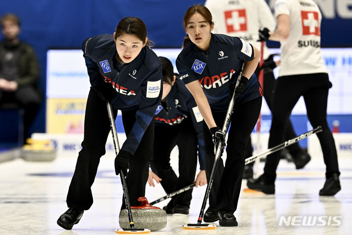 [산드비켄=AP/뉴시스] 한국 여자 컬링 '팀하'가 24일(현지시간) 스웨덴 산드비켄에서 열린 2023 LGT 여자 컬링 세계선수권대회 라운드 로빈 12차전 스위스와 경기하고 있다. 한국은 스위스에 3-5로 패해 5승7패로 공동 9위를 기록하며 상위 6개 팀이 오르는 본선 진출에 실패했다. 2023.03.25.