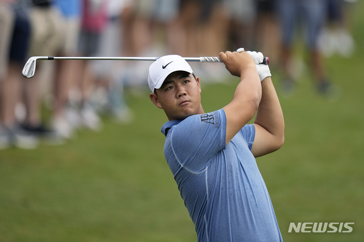 [오스틴=AP/뉴시스] 김주형이 24일(현지시간) 미 텍사스주 오스틴의 오스틴CC에서 열린 미국프로골프(PGA)투어 월드골프챔피언십(WGC) 델매치플레이 조별리그 3차전 3번 그린에서 샷하고 있다. 세계랭킹 1위 스코티 셰플러(미국)를 상대한 김주형은 3홀 차로 패해 1승2패, 조 3위를 기록하며 16강에 오르지 못했다. 2023.03.25.