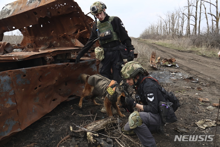[하르키우=AP/뉴시스] 24일(현지시간) 우크라이나 하르키우에서 우크라이나 자원봉사자들이 수색견과 함께 숨진 우크라이나 군인과 러시아 군인의 시신을 찾고 있다. 2023.03.25.