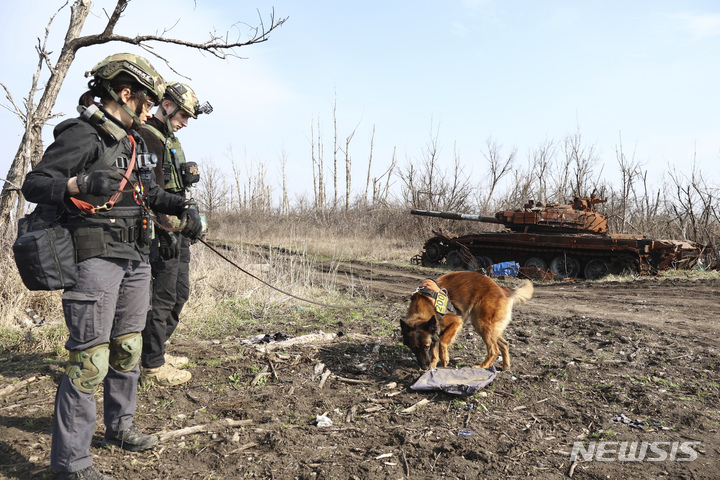 [하르키우=AP/뉴시스] 24일(현지시간) 우크라이나 하르키우에서 우크라이나 자원봉사자들이 수색견과 함께 숨진 우크라이나 군인과 러시아 군인의 시신을 찾고 있다. 2023.03.25.