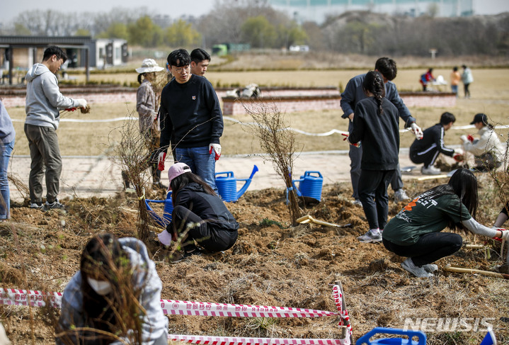 [서울=뉴시스] 정병혁 기자 = 25일 오전 서울 강서구 오쇠삼거리 인근에서 열린 제14회 온난화 식목일 행사에서 서울환경연합 활동가 및 참가자들이 조팝나무를 심고 있다. 2023.03.25. [email protected]
