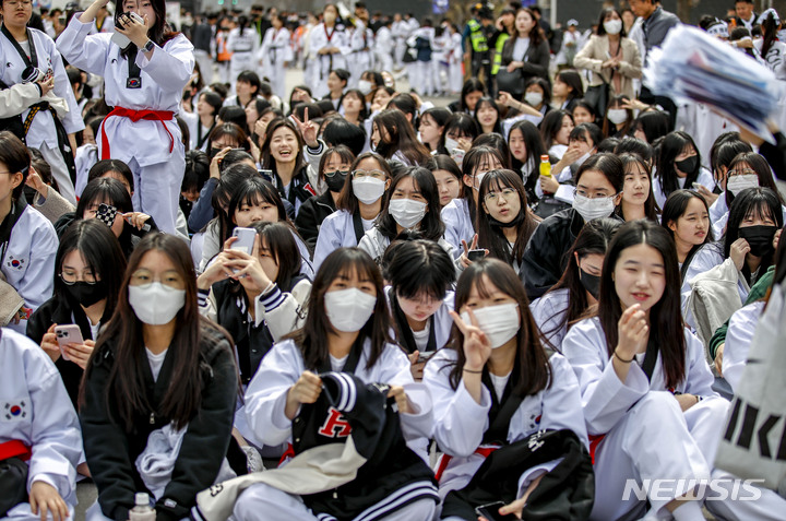 [서울=뉴시스] 정병혁 기자 = 25일 서울 종로구 광화문광장에서 열린 '국기' 태권도 한마음 축제에서 1만 2000여명의 참가자들이 동시에 태극 1장 품세를 선보이는 기네스 기록에 도전에 앞서 대기하고 있다. 이번 행사는 태권도 국기 지정 5주년을 맞아 진행됐다. 2023.03.25. [email protected]