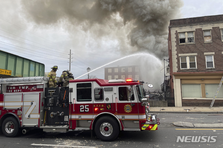 [웨스트레딩=AP/뉴시스] 지난 24일(현지시간) 미 펜실베이니아주 웨스트레딩의 ‘R.M 파머’ 초콜릿 공장 폭발 현장에서 소방관들이 불을 끄고 있다. 이 폭발로 지금까지 최소 2명이 숨지고 5명이 실종된 것으로 알려졌다. 2023.03.26.