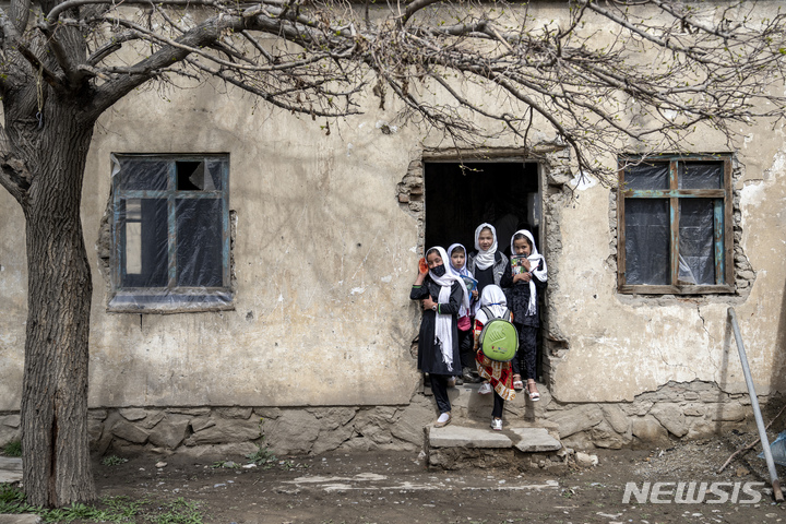 [카불=AP/뉴시스] 25일(현지시간) 아프가니스탄 카불의 한 학교에 여자 어린이들이 새 학년 첫날을 맞아 등교하고 있다. 새 학년이 시작됐지만 2021년 아프간을 장악한 탈레반이 12세 이하 여학생의 교육만을 허용하고 중등학교 교육은 금지해 해당 나이 소녀들은 학교 교육을 받지 못하고 있다. 2023.03.26.