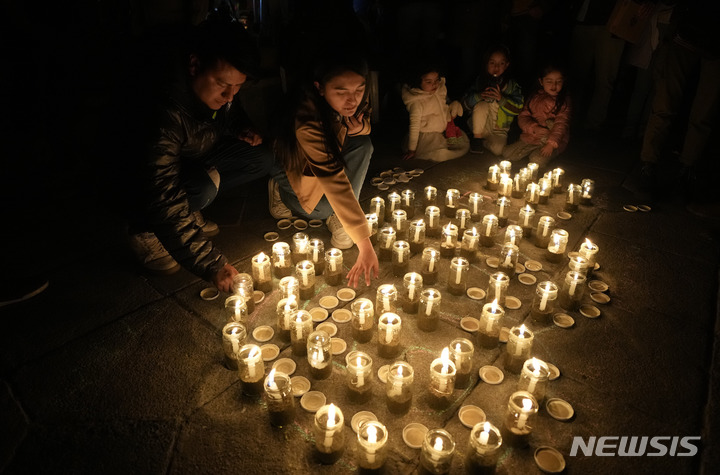 [라파스=AP/뉴시스] 25일(현지시간) 볼리비아 라파스에서 시민들이 '어스아워'(Earth Hour)를 맞아 촛불로 1시간을 상징하는 숫자 '60'을 만들고 있다. '어스아워'는 세계자연기금(WWF)이 주관하는 환경운동 캠페인으로 2007년 호주 시드니에서 시작해 매년 3월 마지막 주 토요일 오후 8시30분부터 1시간 동안 불을 끈다. 2023.03.26.