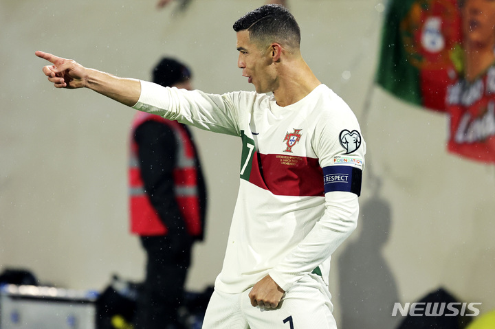 [룩셈부르크=AP/뉴시스] 포르투갈의 크리스티아누 호날두가 26일(현지시간) 룩셈부르크의 스타드 드 룩셈부르크에서 열린 유럽축구연맹(UEFA) 유로 2024 조별리그 J조 2차전 룩셈부르크와의 경기 전반 31분 팀의 네 번째 골을 넣고 기뻐하고 있다. 호날두는 멀티 골을 기록하며 포르투갈의 6-0 대승을 이끌었다. 2023.03.27.
