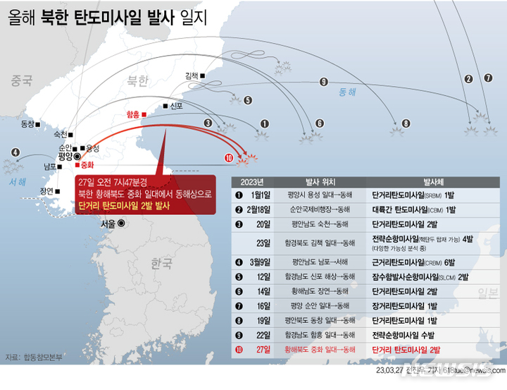 [서울=뉴시스] 합동참모본부는 27일 오전 7시47분경부터 황해북도 중화 일대에서 동해상으로 발사한 단거리 탄도미사일(SRBM) 2발을 포착했다고 밝혔다. 북한의 미사일 도발은 지난 22일 전략순항미사일 도발 이후 약 5일 만이다. (그래픽=전진우 기자)