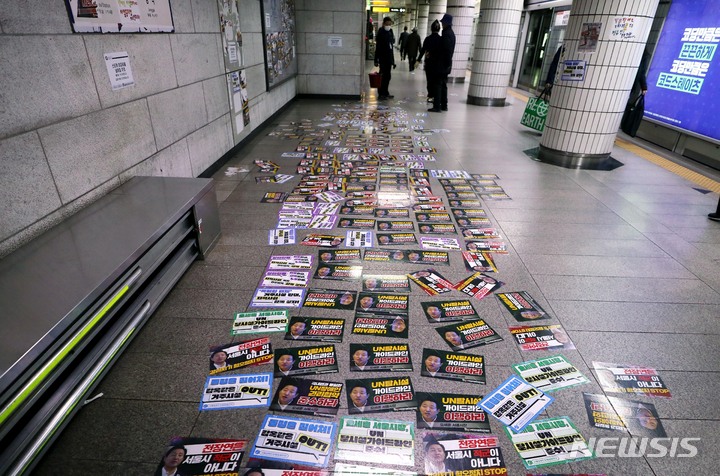 [서울=뉴시스] 조성봉 기자 = 27일 오후 서울의 한 지하철 역 승강장에서 지하철 환경미화원이 전장연 회원들이 붙여놓은 스티커를 제거하다가 포기하고 돌아서고 있다. 스티커에는 'UN탈시설 가이드라인 이행하라', '전장연은 서울시 적군이 아니다 갈라치기 혐오정치 STOP'라는 문구가 있다. 2023.03.27. [email protected]
