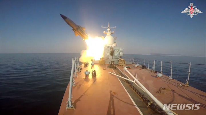 [모스크바=AP/뉴시스] 러시아 국방부가 제공한 사진에 28일 러시아 해군 함정이 일본해(러시아식 표기)에서 모의 표적 미사일 발사 훈련을 하고 있다. 러 국방부는 "태평양 함대의 미사일 함정이 약 100㎞ 거리에서 모의 해상 목표물을 향해 2발의 모스키트 순항 미사일을 성공적으로 발사했다"라고 밝혔다. 2023.03.28.