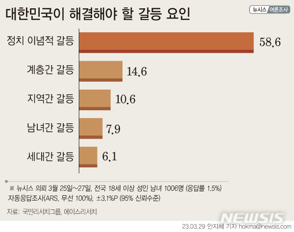 [서울=뉴시스] 뉴시스가 국민리서치그룹과 에이스리서치에 의뢰해 '우리나라 발전을 위해 가장 먼저 해결해야 하는 갈등 요인'을 물은 결과 응답자의 58.6%가 '정치 이념적 갈등'이라고 응답했다. 2위는 계층간 갈등(14.6%), 3위는 지역간 갈등(10.6%)으로 나타났다. 그 뒤로는 남녀간 갈등(7.9%)과 세대간 갈등(6.1%) 순이었다. '잘 모르겠다'고 대답한 사람들은 2.2%로 나타났다. (그래픽=안지혜 기자)