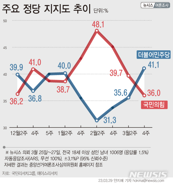 [그래픽] 민주당 지지도, 41.1%…국민의힘 36.0%에 '역전'