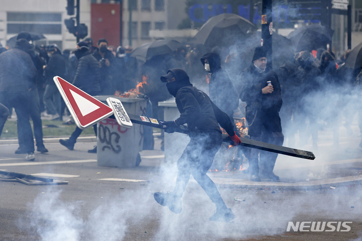 [낭트=AP/뉴시스] 28일(현지시간) 프랑스 서부 낭트에서 연금 개혁 반대 시위를 벌이던 한 남성이 거리 표지판을 뽑아 던지고 있다. 프랑스 전역에서 에마뉘엘 마크롱 정부의 연금 개혁에 반대하는 10차 시위와 파업이 이어졌다. 마크롱 대통령은 인기를 잃더라도 국익을 위해 연금 개혁을 흔들림 없이 추진하겠다고 밝혔다. 2023.03.29.