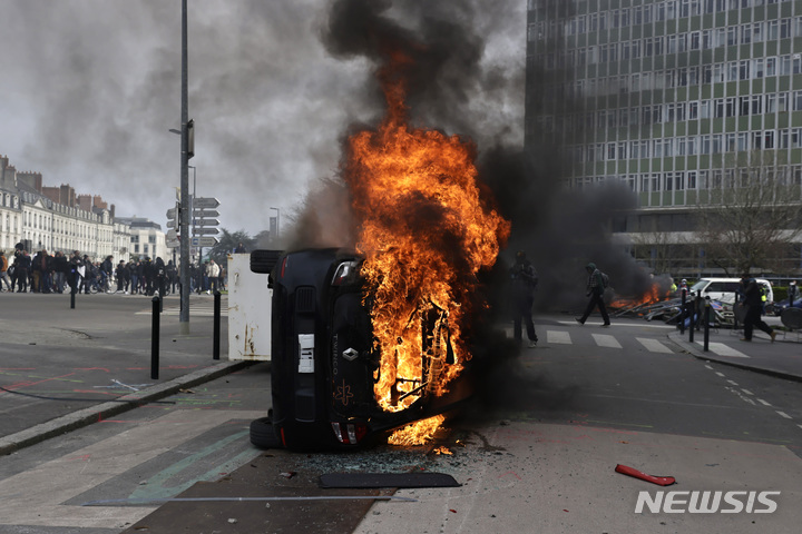 [낭트=AP/뉴시스] 28일(현지시간) 프랑스 낭트 거리에서 자동차 한 대가 불에 타고 있다. 프랑스 전역에서 에마뉘엘 마크롱 정부의 연금 개혁에 반대하는 10차 시위와 파업이 이어졌다. 마크롱 대통령은 인기를 잃더라도 국익을 위해 연금 개혁을 흔들림 없이 추진하겠다고 밝혔다. 2023.03.29.