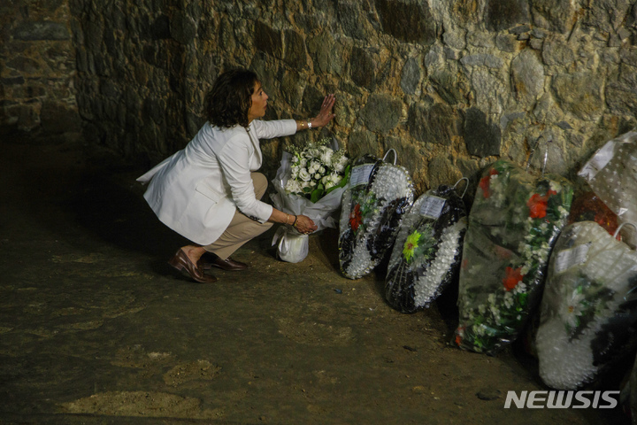 [케이프코스트=AP/뉴시스] 카멀라 해리스 미 부통령이 28일(현지시간) 가나 케이프코스트의 케이프코스트성에 헌화하고 있다. 유네스코 세계문화유산인 이 성은 아메리카 대륙으로 향하는 노예 운송선에 태울 노예들이 갇혀 있던 곳으로 이곳 벽에는 당시 노예들이 긁어서 남긴 낙서가 아직도 남아 있다. 해리스 부통령은 '세컨드 젠틀맨'인 남편 더글러스 엠호프와 함께 중국과 러시아 견제를 위한 아프리카를 순방 중이다. 2023.03.29.