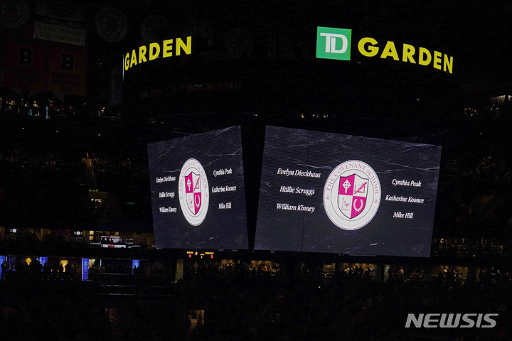 [보스턴=AP/뉴시스] 28일(현지시간) 미 매사추세츠주 보스턴에서 열리는 북미아이스하키리그(NHL) 내슈빌 프레데터스와 보스턴 브루인스와의 경기에 앞서 전날 내슈빌 커버넌트 초등학교 총격으로 숨진 희생자들을 추모하는 동안 경기장 조명이 어두워지고 있다. 2023.03.29.