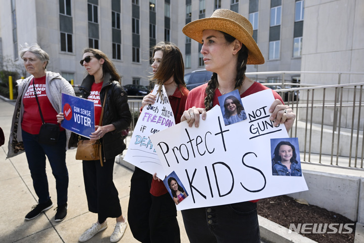 [내슈빌=AP/뉴시스] 28일(현지시간) 미 테네시주 내슈빌 의회 앞에서 딸의 사진이 붙은 손팻말을 든 여성이 다른 운동가들과 함께 총기 규제를 촉구하고 있다. 2023.03.28.