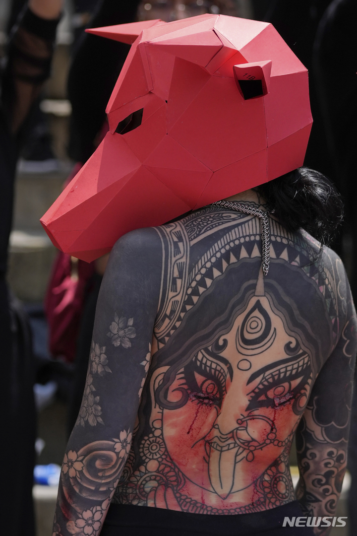 [보고타=AP/뉴시스] 28일(현지시간) 콜롬비아 보고타 의회 밖에서 상반신을 탈의하고 소 모양의 탈을 쓴 동물 권리 운동가가 투우 반대 시위에 참여하고 있다. 2023.03.29.