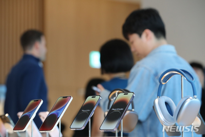 [서울=뉴시스] 권창회 기자 = 29일 오전 서울 강남구 애플스토어 강남점에서 미디어 프리뷰 행사가 진행되고 있다. '이번에 여는 '애플 강남'은 애플 잠실에 이은 국내 다섯 번째 애플 매장으로 오는 31일 정식 개점한다. 2023.03.29. [email protected]