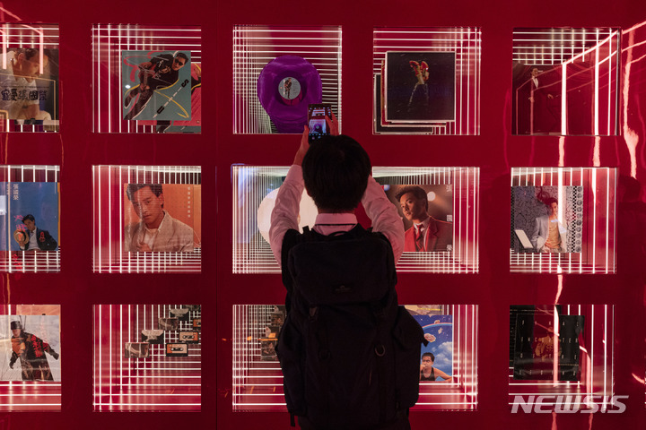 [홍콩=AP/뉴시스] 29일(현지시간) 홍콩에서 배우 장궈룽(장국영) 사망 20주기를 앞두고 회고 전시회가 열려 한 학생이 고인의 음반 커버들을 휴대전화에 담고 있다. 이 전시회에는 1997년, 2000년 장궈룽이 콘서트 때 입었던 의상과 앨범 재킷, 영화 장면들이 전시된다. 2003년 4월 1일 세상을 떠난 장궈룽을 추모하는 전시회와 콘서트가 29일부터 내달 1일까지 열린다. 2023.03.30.