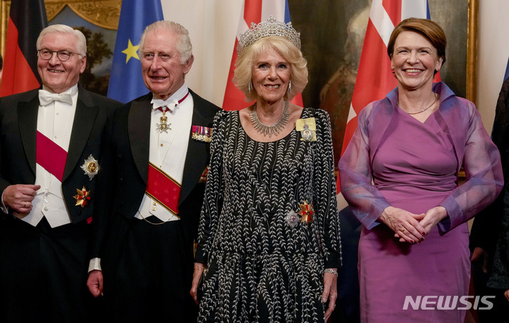 [베를린=AP/뉴시스] 찰스 3세 영국 국왕과 커밀라 왕비가 29일(현지시간) 독일 베를린 벨뷔궁에서 열린 국빈 만찬에 참석해 프랑크 발터 슈타인마이어(왼쪽) 독일 대통령, 엘케 뷔덴벤더(오른쪽) 여사와 함께 기념 촬영을 하고 있다. 2023.03.30.