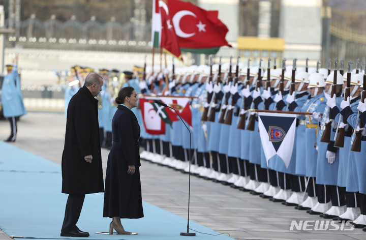 [앙카라=AP/뉴시스] 노바크 카탈린(오른쪽) 헝가리 대통령이 29일(현지시간) 튀르키예 앙카라에서 열린 환영식에 참석해 레제프 타이이프 에르도안 대통령과 함께 튀르키예 의장대를 사열하고 있다. 2023.03.30.