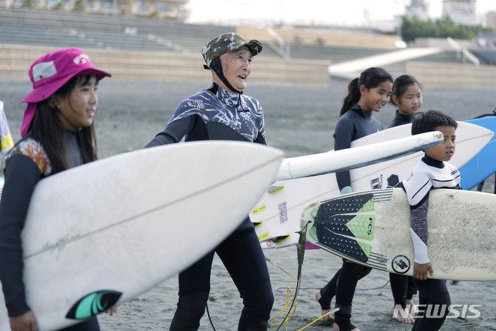 [후지사와=AP/뉴시스] 30일 일본 도쿄 남부 후지사와의 가타세 니시하마 해변에서 올해 89세 서퍼 사노 세이이치(왼쪽)가 어린이들과 함께 파도타기 준비를 하고 있다. 올해 말로 90세가 되는 사노는 2016년 서핑을 시작했으며 기네스북 최고령 남성 서퍼로 인정받았다. 2023.03.30.