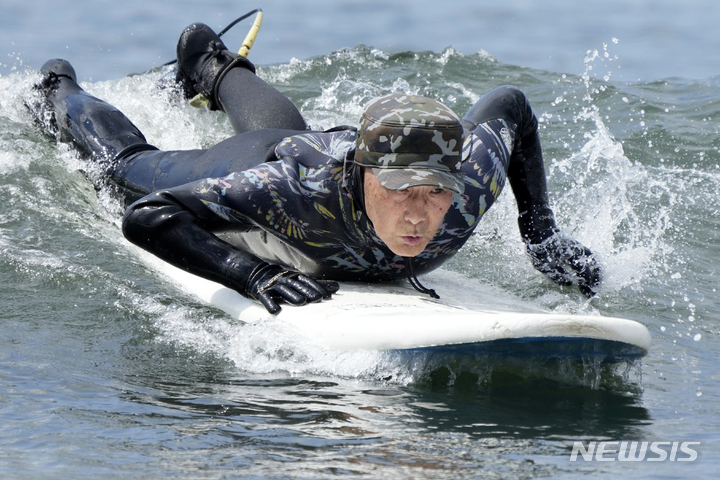 [후지사와=AP/뉴시스] 30일 일본 도쿄 남부 후지사와의 가타세 니시하마 해변에서 올해 89세 서퍼 사노 세이치가 파도에 몸을 싣고 있다. 올해 말로 90세가 되는 사노는 2016년 서핑을 시작했으며 기네스북 최고령 남성 서퍼로 인정받았다. 2023.03.30.