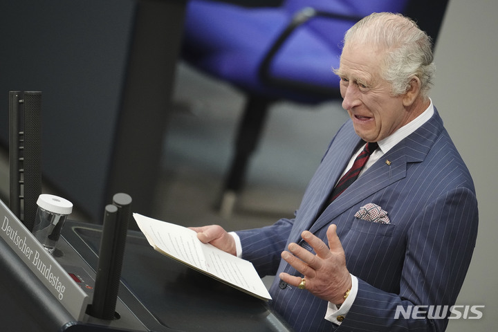 [베를린=AP/뉴시스] 독일 방문 이틀째인 찰스 3세 영국 국왕이 30일(현지시간) 영국 국왕으로는 처음으로 독일 연방의회에서 연설하고 있다. 찰스 3세 국왕은 오는 5월 대관식을 앞두고 3일간의 일정으로 독일을 방문했다. 2023.03.30.