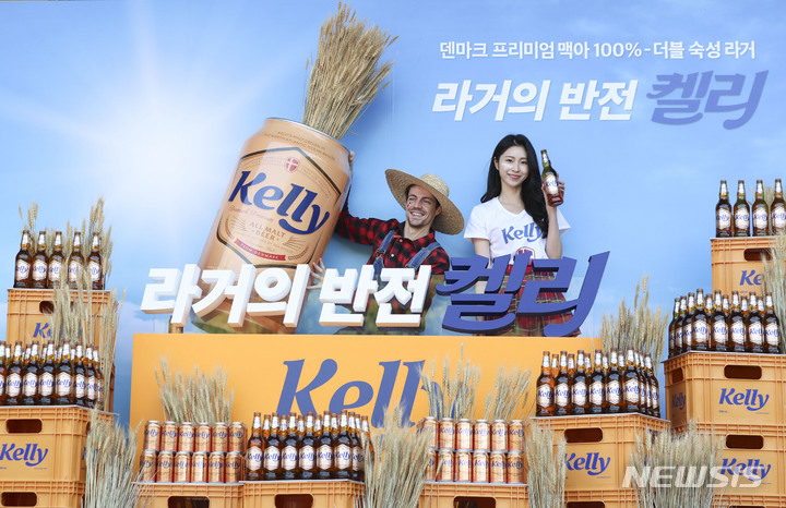 [서울=뉴시스] 김근수 기자 = 30일 오전 서울 성북구 삼청각에서 모델들이 하이트 진로 신제품 맥주 '켈리'를 소개하고 있다. 2023.03.30. [email protected]